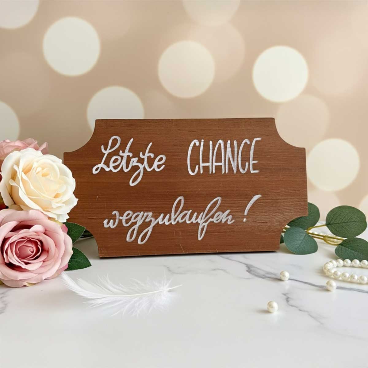 Holzschild „Letzte Chance wegzulaufen“ – humorvolles Detail für eure Hochzeit